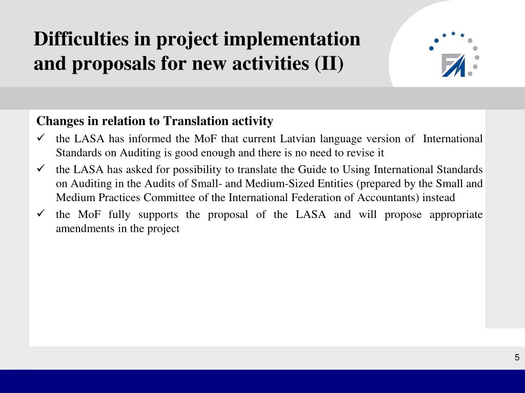 Difficulties in project implementation and proposals for new activities (II) Changes in relation to Translation activity • the LASA has informed the MoF that current Latvian language version of International Standards on Auditing is good enough and there is no need to revise it • the LASA has asked for possibility to translate the Guide to Using International Standards on Auditing in the Audits of Small- and Medium-Sized Entities (prepared by the Small and Medium Practices Committee of the International Federation of Accountants)instead • the MoF fully supports the proposal of the LASA and will propose appropriate amendments in the project