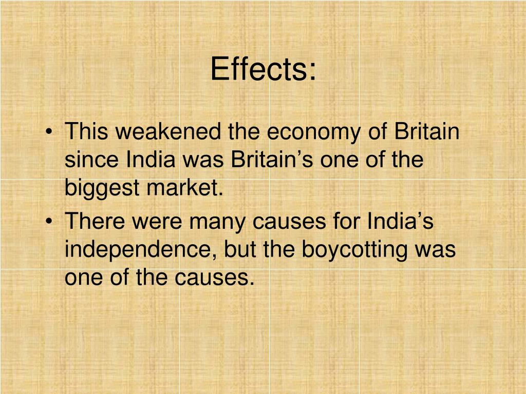 Effects: • This weakened the economy of Britain since India was Britain’s one of the biggest market. • There were many causes for India’s independence, but the boycotting was one of the causes.