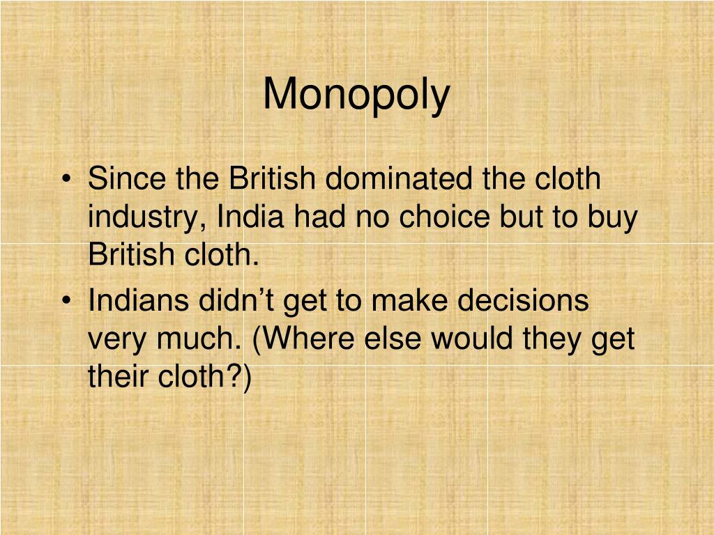 Monopoly • Since the British dominated the cloth industry, India had no choice but to buy British cloth. • Indians didn’t get to make decisions very much. (Where else would they get their cloth?)