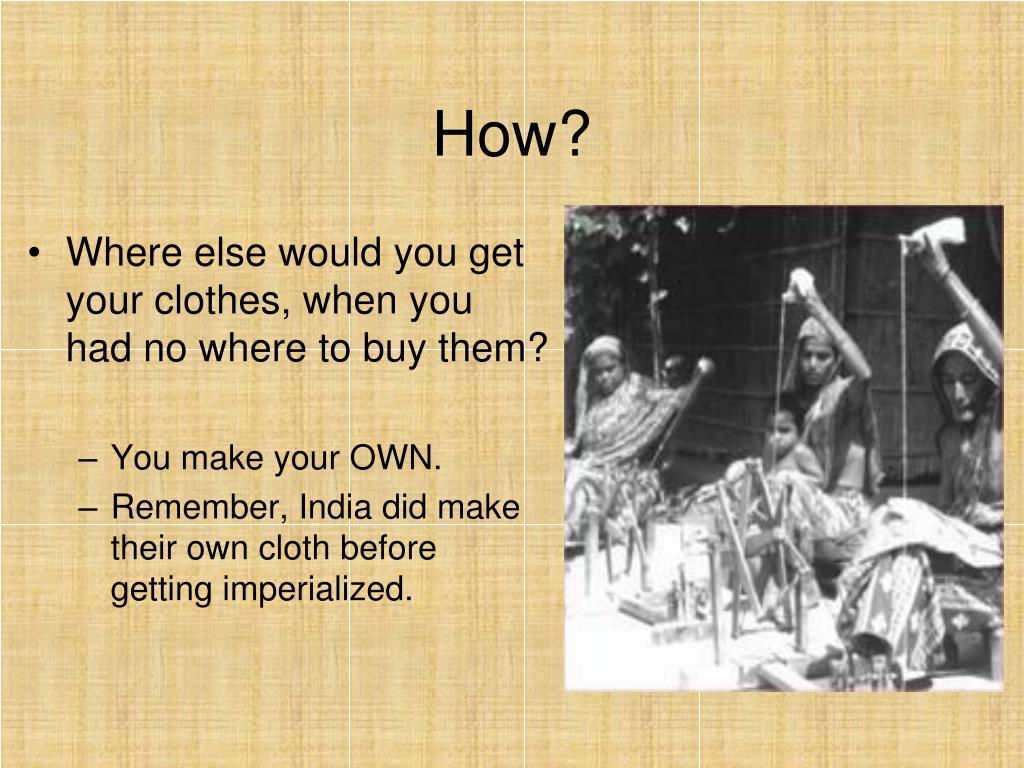 How? • Where else would you get your clothes, when you had no where to buy them? • You make your OWN. • Remember, India did make their own cloth before getting imperialized.