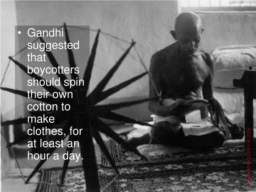 Gandhi suggested that boycotters should spin their own cotton to make clothes, for at least an hour a day.