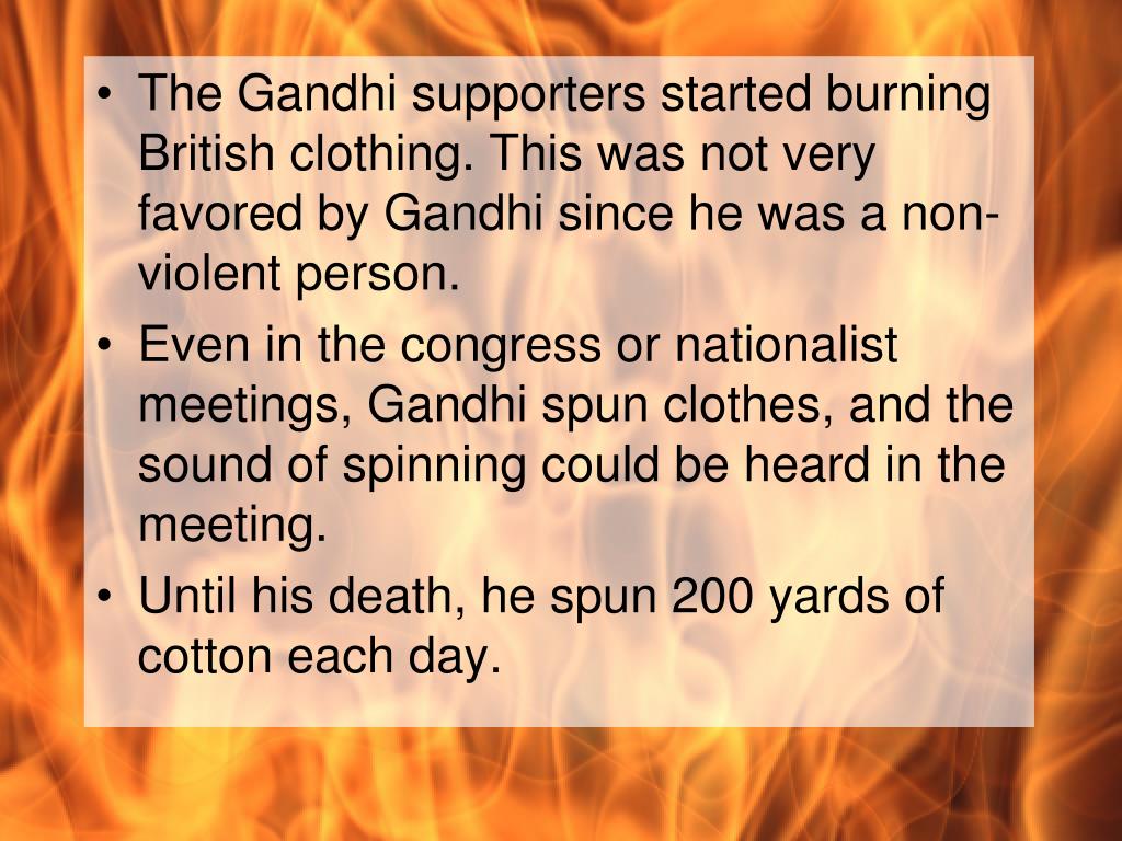 The Gandhi supporters started burning British clothing. This was not very favored by Gandhi since he was a non-violent person. • Even in the congress or nationalist meetings, Gandhi spun clothes, and the sound of spinning could be heard in the meeting. • Until his death, he spun 200 yards of cotton each day.