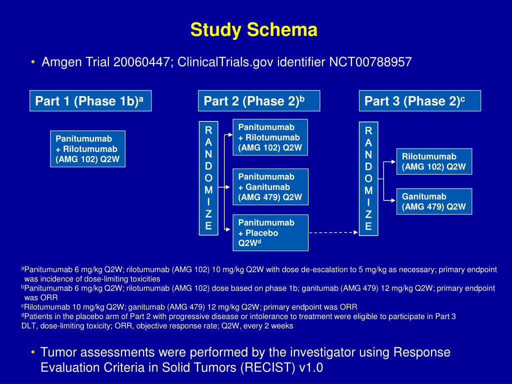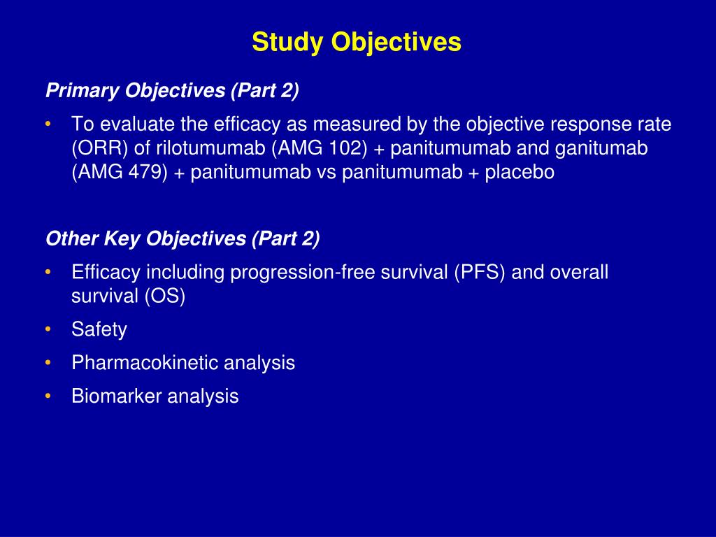 Study Objectives Primary Objectives (Part 2) • To evaluate the efficacy as measured by the objective response rate (ORR) of rilotumumab (AMG 102) + panitumumab and ganitumab (AMG 479) + panitumumab vspanitumumab + placebo Other Key Objectives (Part 2) • Efficacy including progression-free survival (PFS) and overall survival (OS) • Safety • Pharmacokinetic analysis • Biomarker analysis