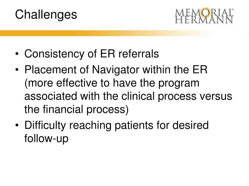 Challenges • Consistency of ER referrals • Placement of Navigator within the ER (more effective to have the program associated with the clinical process versus the financial process) • Difficulty reaching patients for desired follow-up