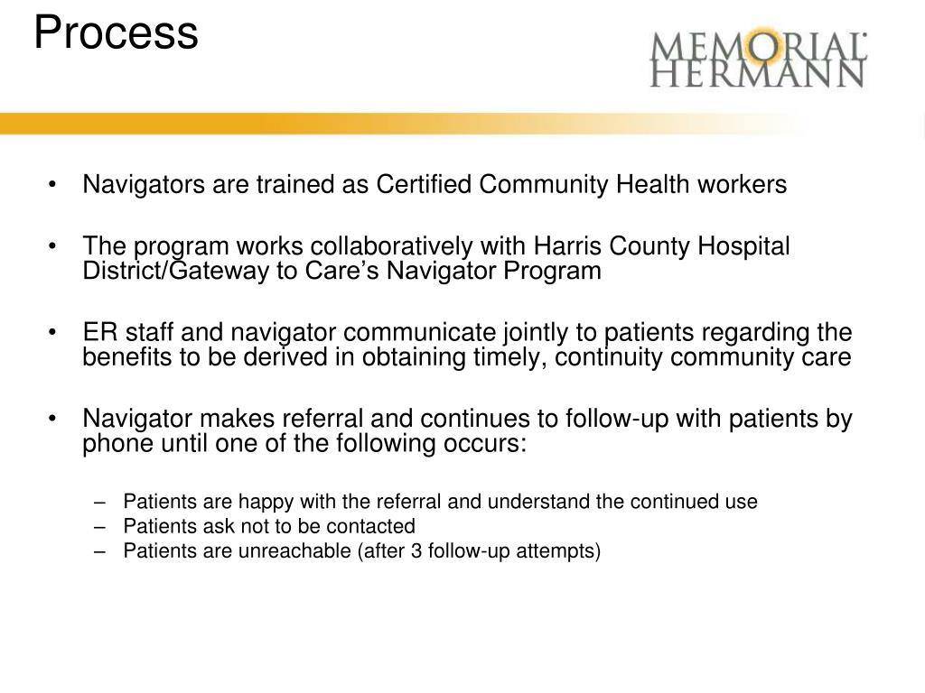 Process • Navigators are trained as Certified Community Health workers • The program works collaboratively with Harris County Hospital District/Gateway to Care’s Navigator Program • ER staff and navigator communicate jointly to patients regarding the benefits to be derived in obtaining timely, continuity community care • Navigator makes referral and continues to follow-up with patients by phone until one of the following occurs: • Patients are happy with the referral and understand the continued use • Patients ask not to be contacted • Patients are unreachable (after 3 follow-up attempts)