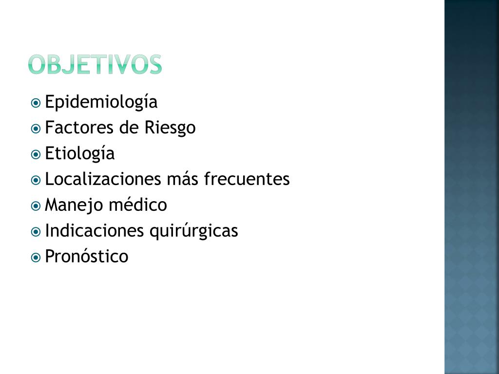 Objetivos • Epidemiología • Factores de Riesgo • Etiología • Localizacionesmásfrecuentes • Manejomédico • Indicacionesquirúrgicas • Pronóstico