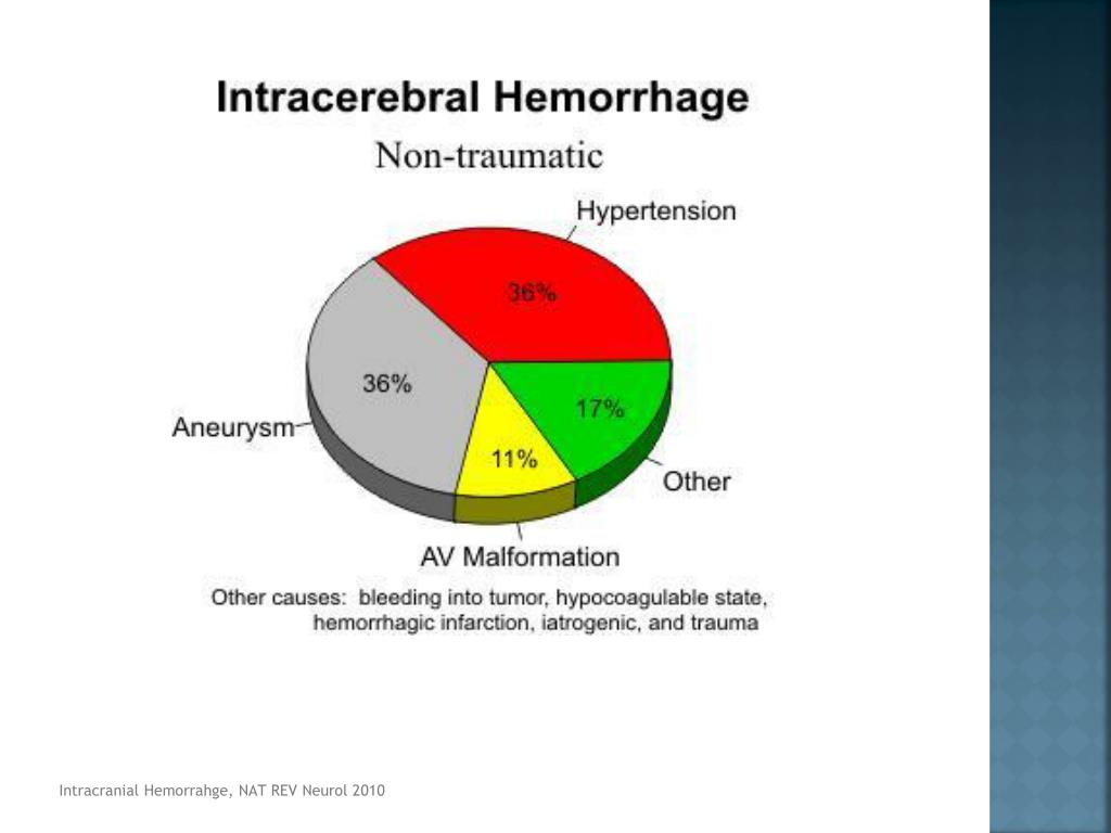 definiciones • Hemorragia intracerebral No traumática Extravasación de sangre hacia el parénquima que puede extenderse hacia ventrículos y en algunos casos hacia espacio subaracnoideo • Principales causas • Hemorragia intracerebral primaria o hipertensiva (espontánea) • Rotura de Aneurisma sacular • MAV IntracranialHemorrhage, Liebeskind, MD, UCLA Stroke Center, E.Medicine 2010