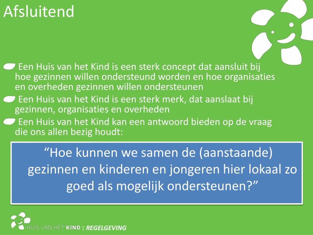 Afsluitend “Hoe kunnen we samen de (aanstaande) gezinnen en kinderen en jongeren hier lokaal zo goed als mogelijk ondersteunen?” • Een Huis van het Kind is een sterk concept dat aansluit bij hoe gezinnen willen ondersteund worden en hoe organisaties en overheden gezinnen willen ondersteunen • Een Huis van het Kind is een sterk merk, dat aanslaat bij gezinnen, organisaties en overheden • Een Huis van het Kind kan een antwoord bieden op de vraag die ons allen bezig houdt: : REGELGEVING