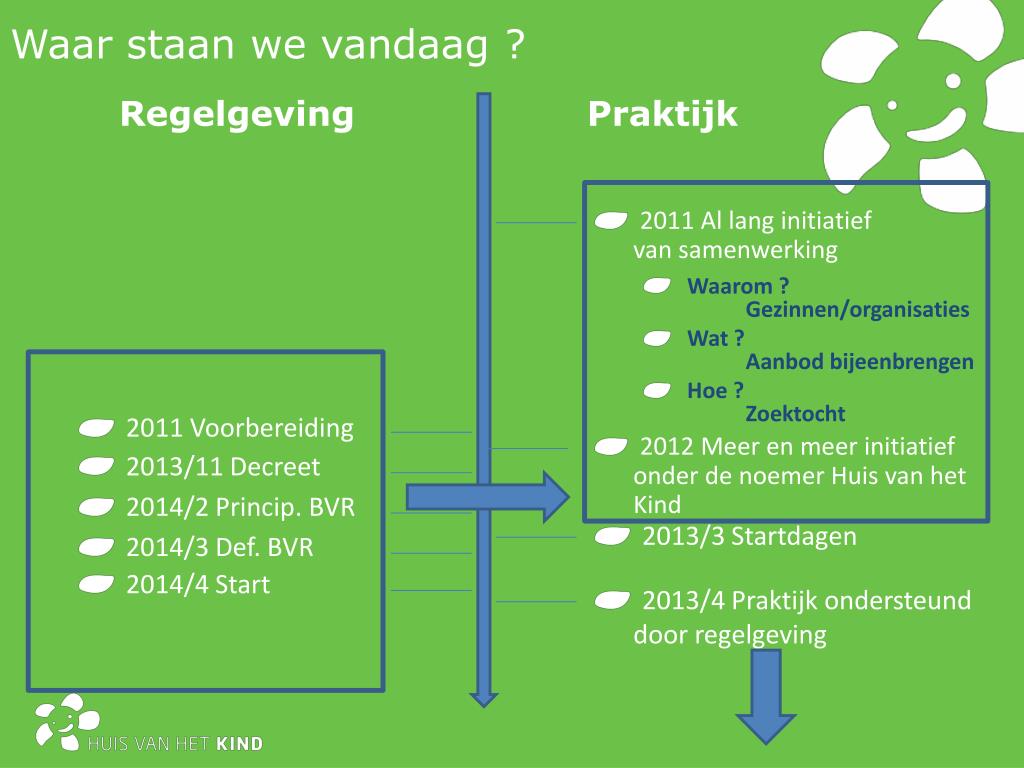 Waar staan we vandaag ? Regelgeving Praktijk • 2….Al lang initiatief van samenwerking • 2011 Voorbereiding • 2012 Meer en meer initiatief onder de noemer Huis van het Kind • 2013/11 Decreet • 2014/2 Princip. BVR • 2013/3 Startdagen • 2014/3 Def. BVR • 2014/4 Start • 2013/4 Praktijk ondersteund door regelgeving