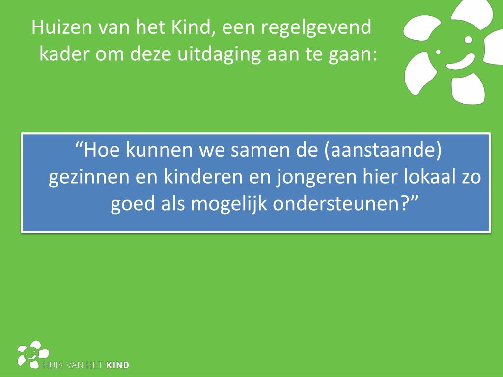 Daarom… • Huizen van het Kind die • krachten bundelen • zodat maatregelen en ondersteuning • coherenter en beter kunnen ontsloten worden • om meer gezinnen beter te ondersteunen : DOELSTELLING