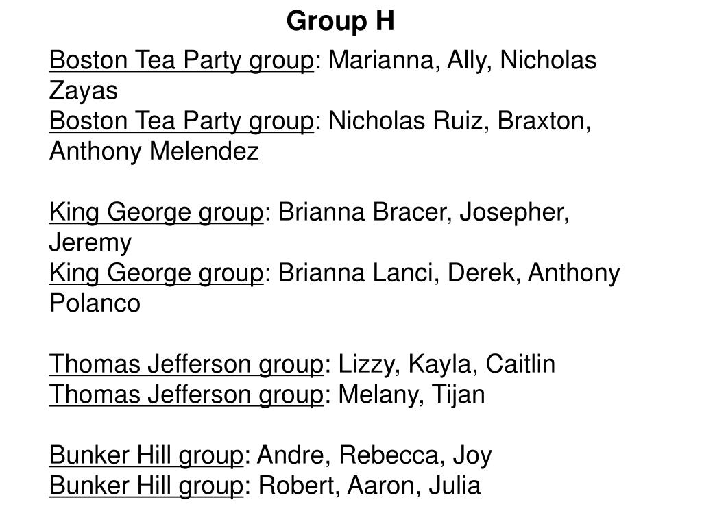 Group H Boston Tea Party group: Marianna, Ally, Nicholas Zayas Boston Tea Party group: Nicholas Ruiz, Braxton, Anthony Melendez King George group: Brianna Bracer, Josepher, Jeremy King George group: Brianna Lanci, Derek, Anthony Polanco Thomas Jefferson group: Lizzy, Kayla, Caitlin Thomas Jefferson group: Melany, Tijan Bunker Hill group: Andre, Rebecca, Joy Bunker Hill group: Robert, Aaron, Julia