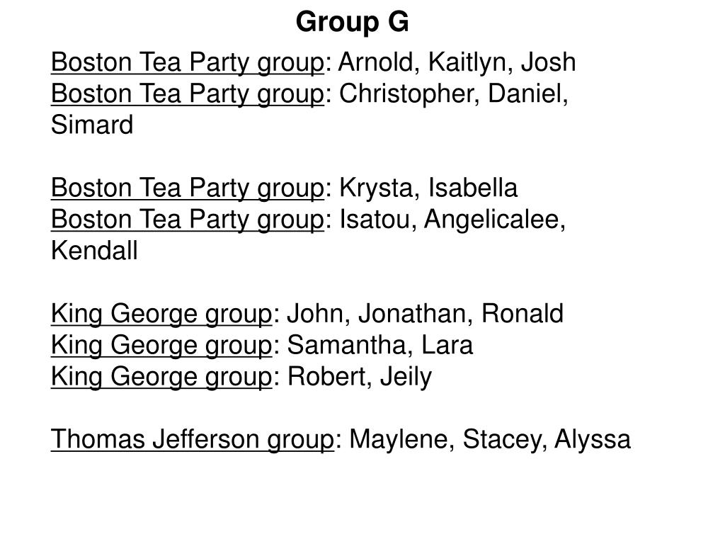 Group G Boston Tea Party group: Arnold, Kaitlyn, Josh Boston Tea Party group: Christopher, Daniel, Simard Boston Tea Party group: Krysta, Isabella Boston Tea Party group: Isatou, Angelicalee, Kendall King George group: John, Jonathan, Ronald King George group: Samantha, Lara King George group: Robert, Jeily Thomas Jefferson group: Maylene, Stacey, Alyssa