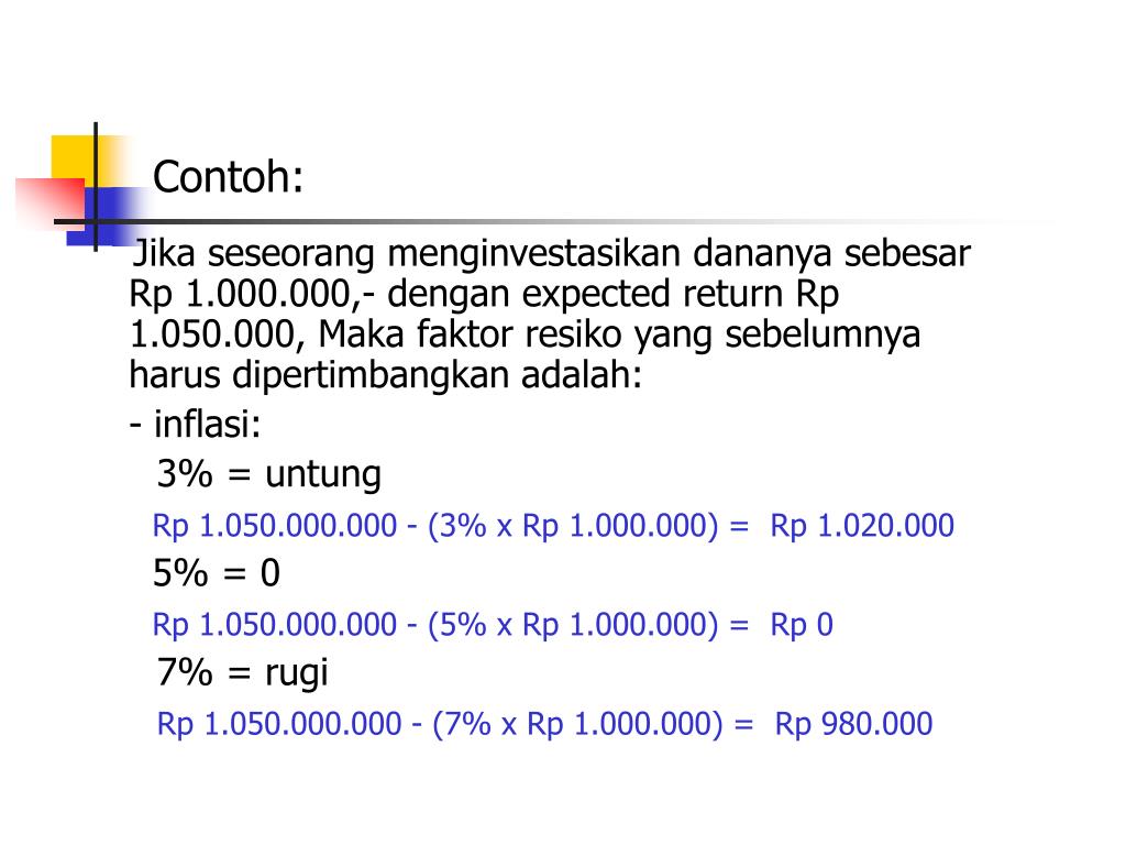 Contoh: Jika seseorang menginvestasikan dananya sebesar Rp 1.000.000,- dengan expected return Rp 1.050.000, Maka faktor resiko yang sebelumnya harus dipertimbangkan adalah: - inflasi: 3% = untung Rp 1.050.000.000 - (3% x Rp 1.000.000) = Rp 1.020.000 5% = 0 Rp 1.050.000.000 - (5% x Rp 1.000.000) = Rp 0 7% = rugi Rp 1.050.000.000 - (7% x Rp 1.000.000) = Rp 980.000