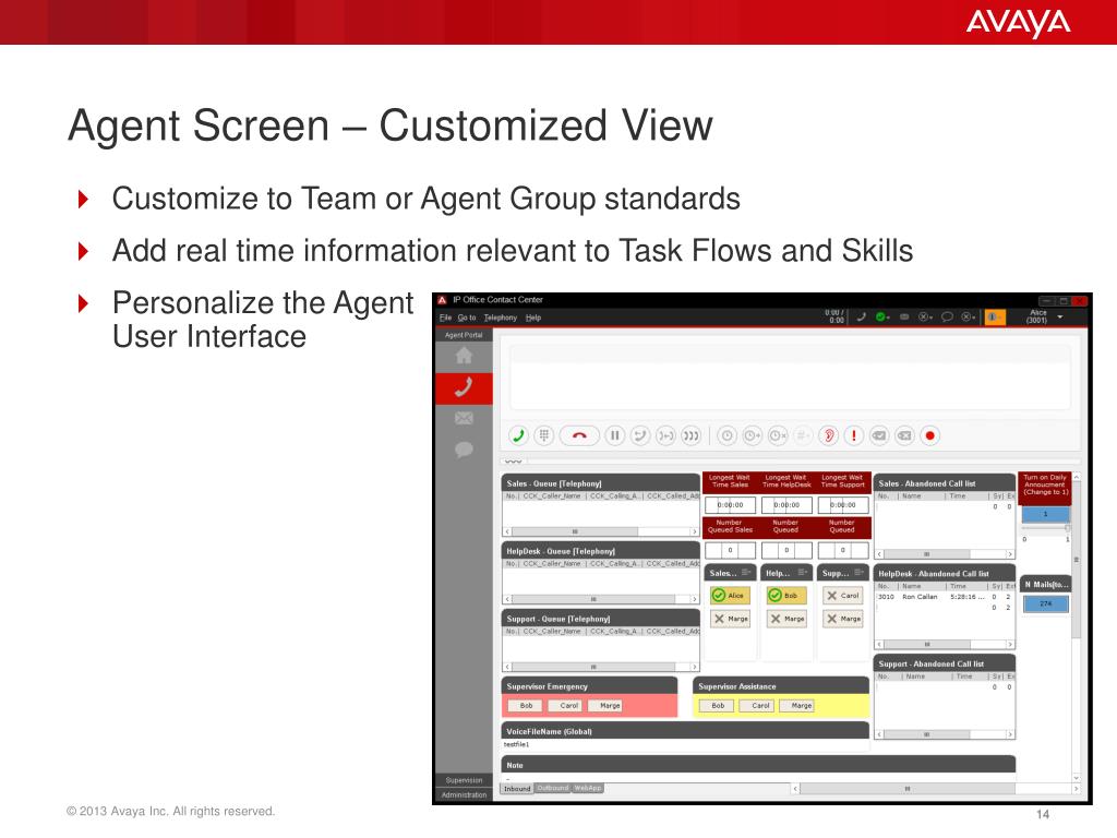 Agent Screen – Customized View • Customize to Team or Agent Group standards • Add real time information relevant to Task Flows and Skills • Personalize the AgentUser Interface