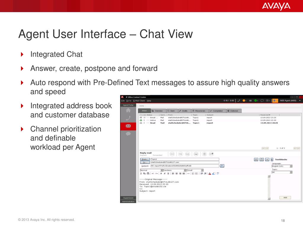 Agent User Interface – Chat View • Integrated Chat • Answer, create, postpone and forward • Auto respond with Pre-Defined Text messages to assure high quality answers and speed • Integrated address bookand customer database • Channel prioritization and definable workload per Agent