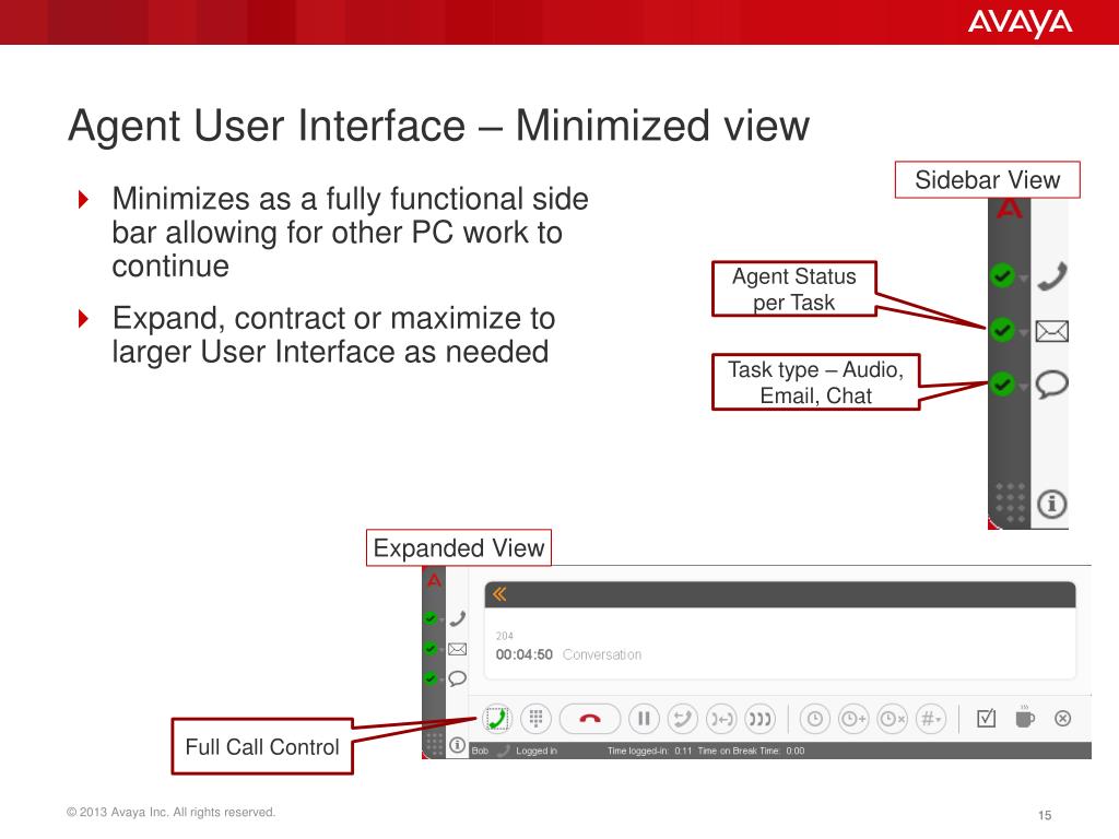 Agent User Interface – Minimized view Sidebar View • Minimizes as a fully functional side bar allowing for other PC work to continue • Expand, contract or maximize to larger User Interface as needed Agent Status per Task Task type – Audio, Email, Chat Expanded View Full Call Control