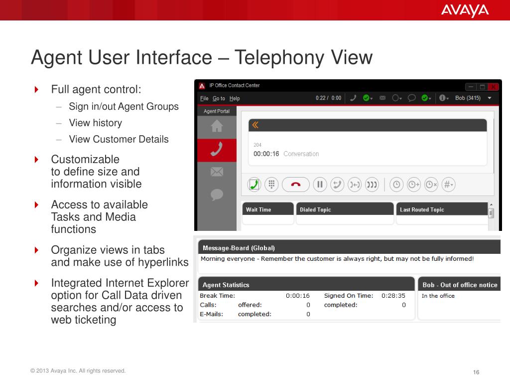 Agent User Interface – Telephony View • Full agent control: • Sign in/out Agent Groups • View history • View Customer Details • Customizable to define size and information visible • Access to available Tasks and Media functions • Organize views in tabs and make use of hyperlinks • Integrated Internet Explorer option for Call Data driven searches and/or access to web ticketing