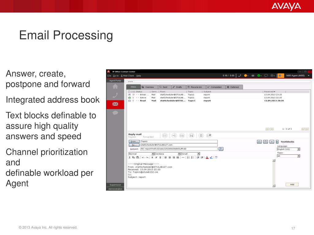 Email Processing Answer, create, postpone and forward Integrated address book Text blocks definable to assure high quality answers and speed Channel prioritization and definable workload per Agent
