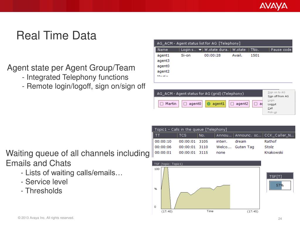 Real Time Data • Agent state per Agent Group/Team • - Integrated Telephony functions • - Remote login/logoff, sign on/sign off • Waiting queue of all channels including • Emails and Chats • - Lists of waiting calls/emails… • - Service level • - Thresholds