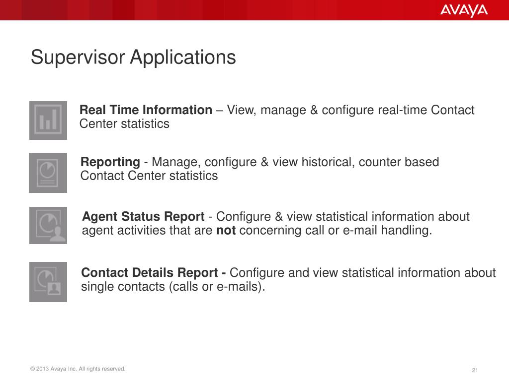 Supervisor Applications Real Time Information– View, manage& configure real-time Contact Center statistics Reporting - Manage, configure &view historical, counter based Contact Center statistics Agent Status Report - Configure & view statistical information about agent activities that are not concerning call or e-mail handling. Contact Details Report - Configure and view statistical information about single contacts (calls or e-mails).