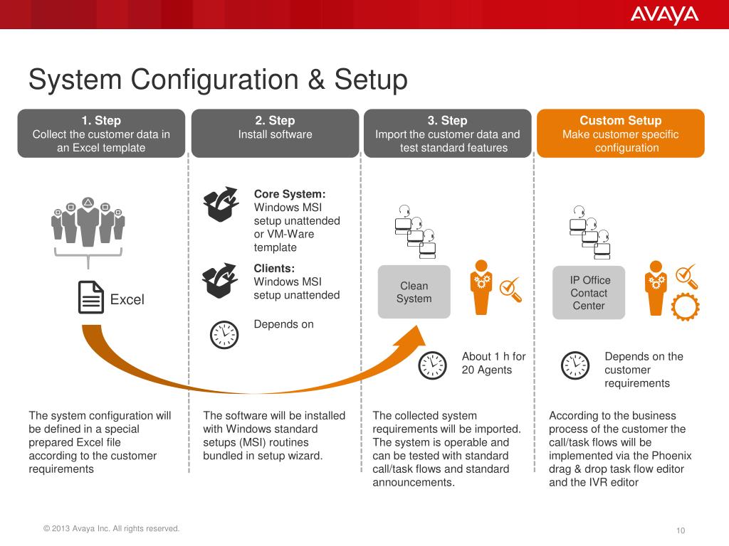 System Configuration & Setup 1. Step Collect the customer data in an Excel template 2. Step Install software 3. Step Import the customer data and test standard features Custom Setup Make customer specific configuration Core System: Windows MSI setup unattended or VM-Ware template Clients: Windows MSI setup unattended Clean System IP Office Contact Center Excel Depends on About 1 h for 20 Agents Depends on the customer requirements The system configuration will be defined in a special prepared Excel file according to the customer requirements The software will be installed with Windows standard setups (MSI) routines bundled in setup wizard. The collected system requirements will be imported. The system is operable and can be tested with standard call/task flows and standard announcements. According to the business process of the customer the call/task flows will be implemented via the Phoenix drag & drop task flow editor and the IVR editor
