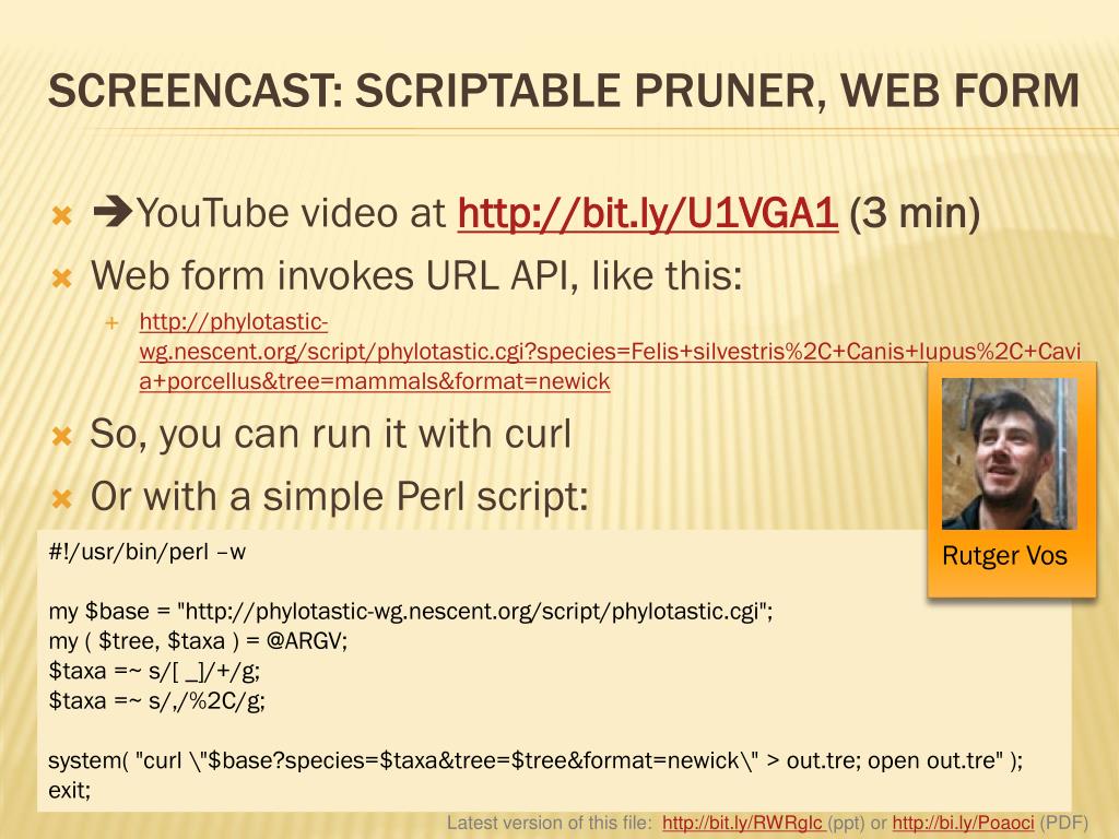 YouTube video at http://bit.ly/U1VGA1 (3 min) • Web form invokes URL API, like this: • http://phylotastic-wg.nescent.org/script/phylotastic.cgi?species=Felis+silvestris%2C+Canis+lupus%2C+Cavia+porcellus&tree=mammals&format=newick • So, you can run it with curl • Or with a simple Perl script: SCREENCAST: SCRIPTABLE PRUNER, WEB FORM Rutger Vos #!/usr/bin/perl –w my $base = "http://phylotastic-wg.nescent.org/script/phylotastic.cgi"; my ( $tree, $taxa ) = @ARGV; $taxa =~ s/[ _]/+/g; $taxa =~ s/,/%2C/g; system( "curl \"$base?species=$taxa&tree=$tree&format=newick\" > out.tre; open out.tre" ); exit;