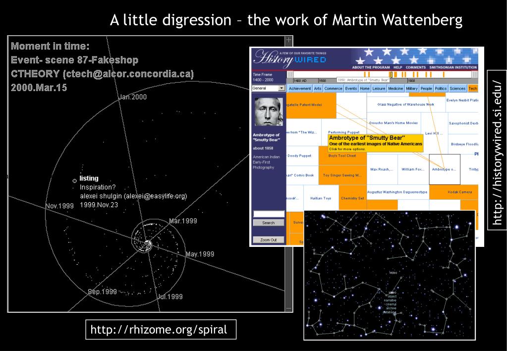 A little digression – the work of Martin Wattenberg http://historywired.si.edu/ http://rhizome.org/spiral http://rhizome.org/spiral