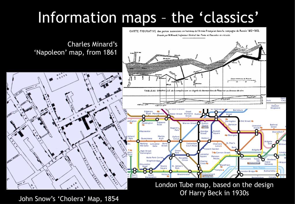 Information maps – the ‘classics’ Charles Minard’s ‘Napoleon’ map, from 1861 London Tube map, based on the design Of Harry Beck in 1930s John Snow’s ‘Cholera’ Map, 1854