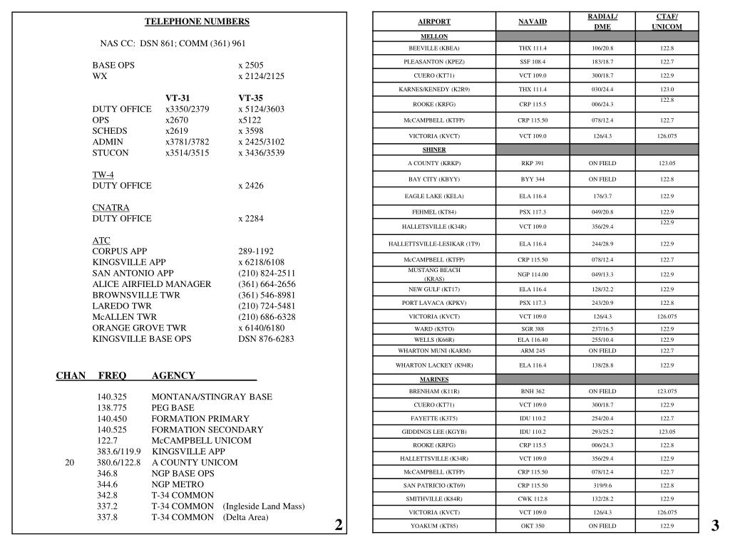 TELEPHONE NUMBERS NAS CC: DSN 861; COMM (361) 961 BASE OPS x 2505 WX x 2124/2125 VT-31 VT-35 DUTY OFFICE x3350/2379 x 5124/3603 OPS x2670 x5122 SCHEDS x2619 x 3598 ADMIN x3781/3782 x 2425/3102 STUCON x3514/3515 x 3436/3539 TW-4 DUTY OFFICE x 2426 CNATRA DUTY OFFICE x 2284 ATC CORPUS APP 289-1192 KINGSVILLE APP x 6218/6108 SAN ANTONIO APP (210) 824-2511 ALICE AIRFIELD MANAGER (361) 664-2656 BROWNSVILLE TWR (361) 546-8981 LAREDO TWR (210) 724-5481 McALLEN TWR (210) 686-6328 ORANGE GROVE TWR x 6140/6180 KINGSVILLE BASE OPS DSN 876-6283 CHAN FREQ AGENCY____________ 140.325 MONTANA/STINGRAY BASE 138.775 PEG BASE 140.450 FORMATION PRIMARY 140.525 FORMATION SECONDARY 122.7 McCAMPBELL UNICOM 383.6/119.9 KINGSVILLE APP 20 380.6/122.8 A COUNTY UNICOM 346.8 NGP BASE OPS 344.6 NGP METRO 342.8 T-34 COMMON 337.2 T-34 COMMON (Ingleside Land Mass) 337.8 T-34 COMMON (Delta Area) 2 3