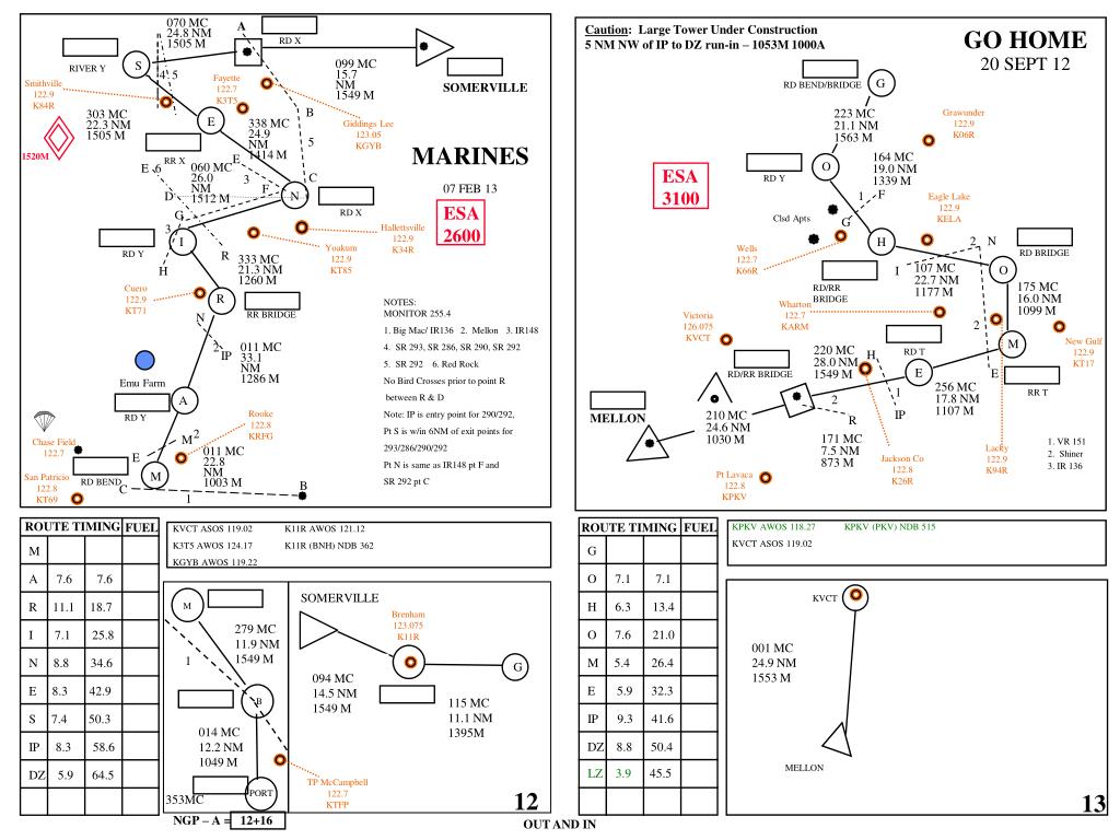 NOBIRD 1. VR1105 A-B, VR156 A-B, VR1106 E-F 2. SR287 4. VR1120/1121 Pt B 3. IR148 (pt I is same as 148 pt C) 5. Marines 6. VR156 7. VR140/168 8. IR 136 9. Shiner/Go Home 10. Mellon DZ - VCT Note: IR148 PT C and NOBIRD PT I are the same BIG MAC 20 SEPT 12 28 AUG 10 RD T RD Y Dilley 122.9 K24R McDONALD Cuero 122.9 KT71 PT OF LAND 3 A ESA 3100 201 MC 15.0 NM 1345M B/E B 5 I 279 MC 25.8 NM 1883 M 127 MC 17.5 NM 1878 M 334 MC 15.3 NM 1461M 6 049 MC 22.7 NM 1470 M Pleasanton 122.7 KPEZ B RD BEND C/D D/C RD BEND 4 4 G A C 125 MC 18.2 NM 1133 M R RD BRIDGE 092 MC 26.2 NM 2045 M RD X B E/B M 2 B G C 2 3 RD BRIDGE 265 MC 24.3 NM 1350 M A R 5 Beeville 122.8 K3R0 A H Cotulla 122.7 KCOT B D Victoria 126.075 KVCT McKinley 122.8 KT30 A L1 A 3 037 MC 21.1 NM 1493 M 1 A RD T 305 MC 17.2 NM 1382 M Live Oak 122.9 K8T6 RD T O 2 N Karnes 123.0 K2R9 B M G 176 MC 15.1 NM 1080 M M RD X RD BEND I * RD T B C ESA 2600 7 288 MC 14.3 NM 1185 M IP B 1 C 10 280 MC 21.7 NM 1549 M 9 A Dilley 122.9 K24R 133 MC 21.4 NM 1039 M Emu Farm Pt Lavaca 122.8 KPKV San Patricio 122.8 KBEA NOTES: MONITOR 255.4 AVOID EMU FARM BY 1500 AGL AND 3NM AVOID EMU FARM BY 1500 AGL AND 3NM 1. IR136 5. VR1120 B-C / VR1121A-B 8. IR149 2. Mellon 6. VR1105 C-D-E / VR1106B-C-D-E 9. VR156 3. Marines 7. VR1122 F-G / VR1123 A-B 10. SR281 4. VR168 MELLON * 255.4 @ Jourdanton paralleling SR 287 from B to A 500A FUEL ROUTE TIMING ROUTE TIMING FUEL KCOT ASOS 118.32 KVCT ASOS 119.02 KPKV AWOS 118.27 N B O 8.7 8.7 I 7.2 7.2 N 047 MC 21.4 NM 1517 M B 7.0 15.7 KVCT 014 MC 12.2 NM 1049 M G 4.8 12.0 B I 7.6 23.3 M 5.7 17.7 001 MC 24.9 NM 1553 M R 5.8 29.1 DILLEY A 5.1 22.8 TP McCampbell 122.7 KTFP D 6.1 35.2 C 5.0 27.8 P IP 5.0 40.2 IP 8.1 35.9 034 MC 7.3 NM 1883 M 355 MC 11.2 NM 1049 M DZ 10.9 51.1 DZ 9.0 44.9 MELLON LZ 8.8 44.7 20 21 McDONALD KNGP OUT AND IN