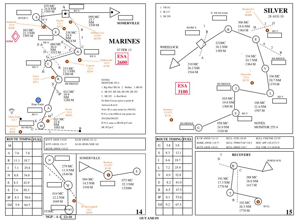 1. VR142 • 2. IR 127 • 3. SR 290 SILVER 28 AUG 10 Houston Co 122.9 KDKR N. TIP OF DAM 306 MC 19.6 NM 1364 M G 2 1 H RD/RR X R B RD T E 222MC 18.2 NM 1389 M A WHEELOCK 2 B 334 MC 24.7 NM 1364 M A RR BRIDGE 210 MC 26.2 NM 1544 M V Huntsville 122.8 KUTS 336 MC 20.7 NM 1379 M RD BRIDGE ESA 3100 I L RD T 010 MC 19.8 NM 1300 M 106 MC 21.6 NM 1507 M Brenham 123.075 K11R S RD Y 058 MC 24.9 NM 1320 M NOTES: MONITOR 255.4 RD BRIDGE G ROUTE TIMING FUEL K11R AWOS 121.12 KCLL ATIS 126.85 KCLL UNICOM 122.95 KDKR AWOS 118.77 KCLL TWR/CTAF 118.5 HOU APP 120.4/371.9 KUTS ASOS 119.42 KCLL GRND 128.7 CLL VOR 113.3/CH 80 G 3.8 3.8 3 S 8.3 12.1 RECOVERY D I 6.6 18.7 W L 7.2 25.9 C V 6.9 32.8 288 MC 18.6 NM 1417 M 191 MC 17.3 NM 1770 M E 8.2 41.0 R 6.5 47.5 T IP 6.1 53.6 B 102 MC 26.3 NM 1770 M DZ 9.2 67.5 KCLL A 070 MC 24.8 NM 1505 M RD X S 099 MC 15.7 NM 1549 M RIVER Y 4 5 Fayette 122.7 K3T5 Smithville 122.9 K84R SOMERVILLE B 303 MC 22.3 NM 1505 M E Giddings Lee 123.05 KGYB 338 MC 24.9 NM 1414 M 5 MARINES 07 FEB 13 1520M E RR X E 6 060 MC 26.0 NM 1512 M C 3 F D N ESA 2600 RD X G 3 Hallettsville 122.9 K34R I Yoakum 122.9 KT85 R RD Y 333 MC 21.3 NM 1260 M H Cuero 122.9 KT71 R NOTES: MONITOR 255.4 1. Big Mac/ IR136 2. Mellon 3. IR148 4. SR 293, SR 286, SR 290, SR 292 5. SR 292 6. Red Rock No Bird Crosses prior to point R between R & D Note: IP is entry point for 290/292, Pt S is w/in 6NM of exit points for 293/286/290/292 Pt N is same as IR148 pt F and SR 292 pt C N RR BRIDGE 2 012 MC 19.9 NM 1286 M IP Emu Farm A Rooke 122.8 KRFG 2 RD Y M Chase Field 122.7 011 MC 22.8 NM 1003 M E M San Patricio 122.8 KT69 RD BEND B C 1 ROUTE TIMING FUEL KVCT ASOS 119.02 K11R AWOS 121.12 K3T5 AWOS 124.17 K11R (BNH) NDB 362 KGYB AWOS 119.22 M A 7.6 7.6 SOMERVILLE R 11.1 18.7 M WHEELOCK Brenham 123.075 K11R 279 MC 11.9 NM 1549 M I 7.1 25.8 S 1 N 8.8 34.6 094 MC 14.5 NM 1549 M 075 MC 32.3 NM 1320M E 8.3 42.9 B S 7.4 50.3 014 MC 12.2 NM 1049 M IP 8.3 58.6 DZ 5.9 64.5 TP McCampbell 122.7 KTFP 14 15 PORT 353MC NGP – A = 12+16 OUT AND IN