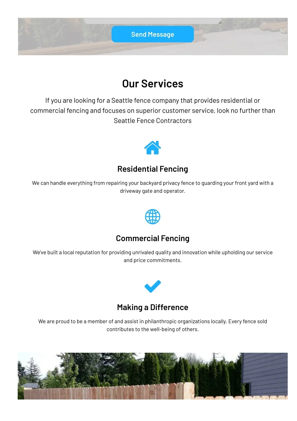 Send Message Our Services If you are looking for a Seattle fence company that provides residential or commercial fencing and focuses on superior customer service, look no further than Seattle Fence Contractors Residential Fencing We can handle everything from repairing your backyard privacy fence to guarding your front yard with a driveway gate and operator. Commercial Fencing We've built a local reputation for providing unrivaled quality and innovation while upholding our service and price commitments. Making a Difference We are proud to be a member of and assist in philanthropic organizations locally. Every fence sold contributes to the well-being of others.