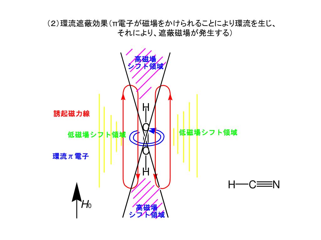 (2)環流遮蔽効果(π電子が磁場をかけられることにより環流を生じ、(2)環流遮蔽効果(π電子が磁場をかけられることにより環流を生じ、 それにより、遮蔽磁場が発生する)