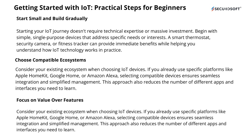 12. Getting Started with IoT: Practical Steps for Beginners Start Small and Build Gradually Starting your IoT journey doesn't require technical expertise or massive investment. Begin with simple, single-purpose devices that address specific needs or interests. A smart thermostat, security camera, or fitness tracker can provide immediate benefits while helping you understand how IoT technology works in practice. Choose Compatible Ecosystems Consider your existing ecosystem when choosing IoT devices. If you already use specific platforms like Apple HomeKit, Google Home, or Amazon Alexa, selecting compatible devices ensures seamless integration and simplified management. This approach also reduces the number of different apps and interfaces you need to learn. Focus on Value Over Features Consider your existing ecosystem when choosing IoT devices. If you already use specific platforms like Apple HomeKit, Google Home, or Amazon Alexa, selecting compatible devices ensures seamless integration and simplified management. This approach also reduces the number of different apps and interfaces you need to learn.