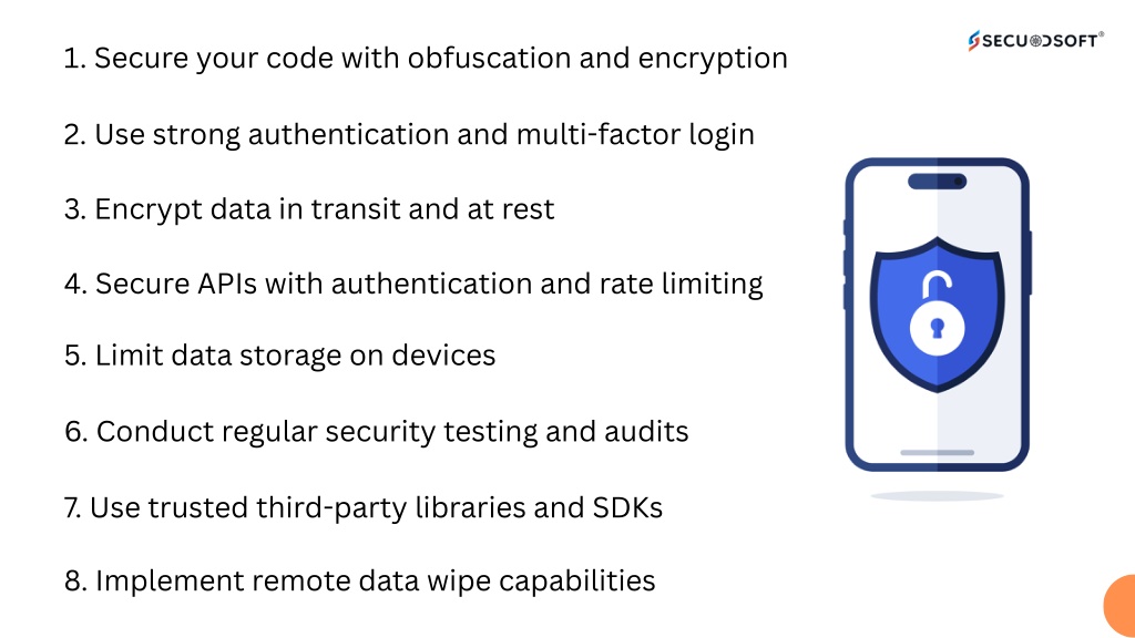 1. Secure your code with obfuscation and encryption 2. Use strong authentication and multi-factor login 3. Encrypt data in transit and at rest 4. Secure APIs with authentication and rate limiting 5. Limit data storage on devices 6. Conduct regular security testing and audits 7. Use trusted third-party libraries and SDKs 8. Implement remote data wipe capabilities