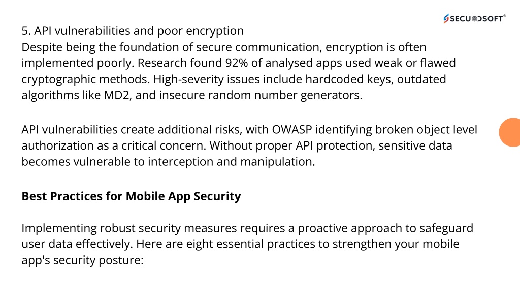 5. API vulnerabilities and poor encryption Despite being the foundation of secure communication, encryption is often implemented poorly. Research found 92% of analysed apps used weak or flawed cryptographic methods. High-severity issues include hardcoded keys, outdated algorithms like MD2, and insecure random number generators. API vulnerabilities create additional risks, with OWASP identifying broken object level authorization as a critical concern. Without proper API protection, sensitive data becomes vulnerable to interception and manipulation. Best Practices for Mobile App Security Implementing robust security measures requires a proactive approach to safeguard user data effectively. Here are eight essential practices to strengthen your mobile app's security posture: