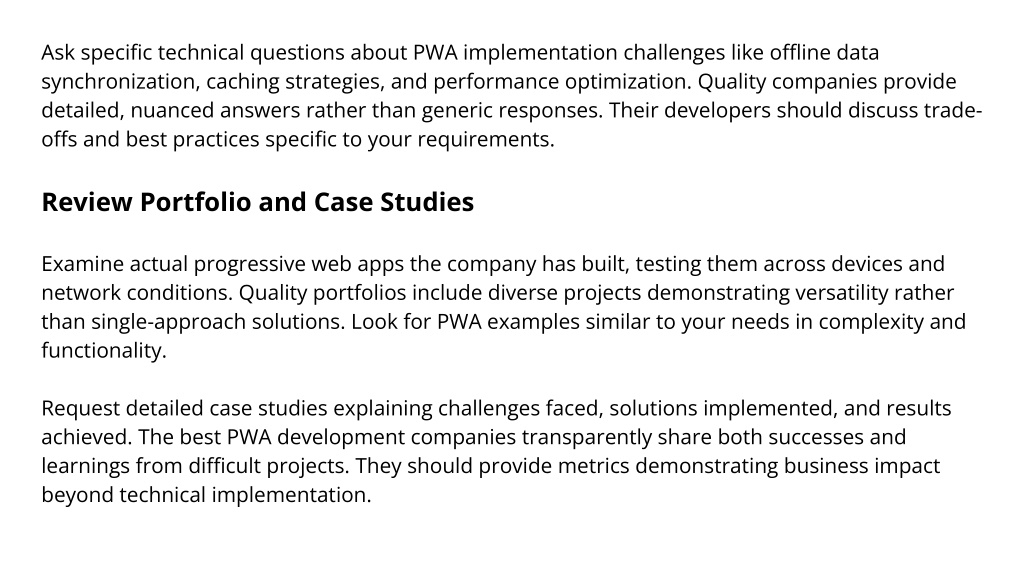 Ask specific technical questions about PWA implementation challenges like offline data synchronization, caching strategies, and performance optimization. Quality companies provide detailed, nuanced answers rather than generic responses. Their developers should discuss trade- offs and best practices specific to your requirements. Review Portfolio and Case Studies Examine actual progressive web apps the company has built, testing them across devices and network conditions. Quality portfolios include diverse projects demonstrating versatility rather than single-approach solutions. Look for PWA examples similar to your needs in complexity and functionality. Request detailed case studies explaining challenges faced, solutions implemented, and results achieved. The best PWA development companies transparently share both successes and learnings from difficult projects. They should provide metrics demonstrating business impact beyond technical implementation.