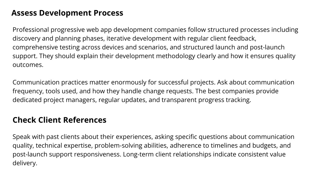 Assess Development Process Professional progressive web app development companies follow structured processes including discovery and planning phases, iterative development with regular client feedback, comprehensive testing across devices and scenarios, and structured launch and post-launch support. They should explain their development methodology clearly and how it ensures quality outcomes. Communication practices matter enormously for successful projects. Ask about communication frequency, tools used, and how they handle change requests. The best companies provide dedicated project managers, regular updates, and transparent progress tracking. Check Client References Speak with past clients about their experiences, asking specific questions about communication quality, technical expertise, problem-solving abilities, adherence to timelines and budgets, and post-launch support responsiveness. Long-term client relationships indicate consistent value delivery.