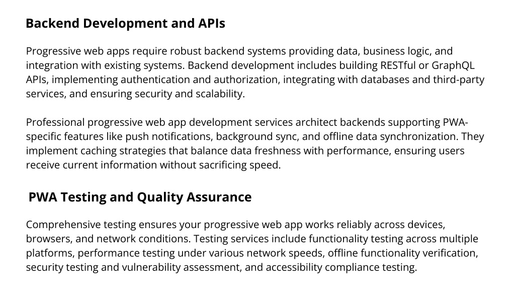Backend Development and APIs Progressive web apps require robust backend systems providing data, business logic, and integration with existing systems. Backend development includes building RESTful or GraphQL APIs, implementing authentication and authorization, integrating with databases and third-party services, and ensuring security and scalability. Professional progressive web app development services architect backends supporting PWA- specific features like push notifications, background sync, and offline data synchronization. They implement caching strategies that balance data freshness with performance, ensuring users receive current information without sacrificing speed. PWA Testing and Quality Assurance Comprehensive testing ensures your progressive web app works reliably across devices, browsers, and network conditions. Testing services include functionality testing across multiple platforms, performance testing under various network speeds, offline functionality verification, security testing and vulnerability assessment, and accessibility compliance testing.