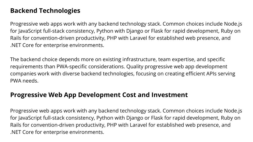 Backend Technologies Progressive web apps work with any backend technology stack. Common choices include Node.js for JavaScript full-stack consistency, Python with Django or Flask for rapid development, Ruby on Rails for convention-driven productivity, PHP with Laravel for established web presence, and .NET Core for enterprise environments. The backend choice depends more on existing infrastructure, team expertise, and specific requirements than PWA-specific considerations. Quality progressive web app development companies work with diverse backend technologies, focusing on creating efficient APIs serving PWA needs. Progressive Web App Development Cost and Investment Progressive web apps work with any backend technology stack. Common choices include Node.js for JavaScript full-stack consistency, Python with Django or Flask for rapid development, Ruby on Rails for convention-driven productivity, PHP with Laravel for established web presence, and .NET Core for enterprise environments.