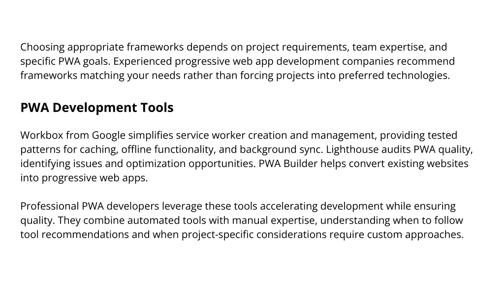 Choosing appropriate frameworks depends on project requirements, team expertise, and specific PWA goals. Experienced progressive web app development companies recommend frameworks matching your needs rather than forcing projects into preferred technologies. PWA Development Tools Workbox from Google simplifies service worker creation and management, providing tested patterns for caching, offline functionality, and background sync. Lighthouse audits PWA quality, identifying issues and optimization opportunities. PWA Builder helps convert existing websites into progressive web apps. Professional PWA developers leverage these tools accelerating development while ensuring quality. They combine automated tools with manual expertise, understanding when to follow tool recommendations and when project-specific considerations require custom approaches.