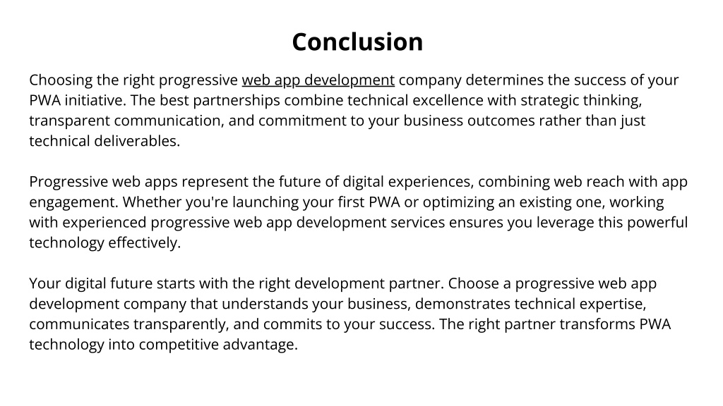 Conclusion Choosing the right progressive web app development company determines the success of your PWA initiative. The best partnerships combine technical excellence with strategic thinking, transparent communication, and commitment to your business outcomes rather than just technical deliverables. Progressive web apps represent the future of digital experiences, combining web reach with app engagement. Whether you're launching your first PWA or optimizing an existing one, working with experienced progressive web app development services ensures you leverage this powerful technology effectively. Your digital future starts with the right development partner. Choose a progressive web app development company that understands your business, demonstrates technical expertise, communicates transparently, and commits to your success. The right partner transforms PWA technology into competitive advantage.