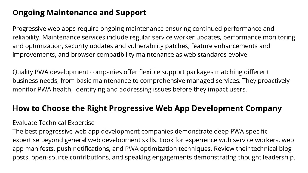 Ongoing Maintenance and Support Progressive web apps require ongoing maintenance ensuring continued performance and reliability. Maintenance services include regular service worker updates, performance monitoring and optimization, security updates and vulnerability patches, feature enhancements and improvements, and browser compatibility maintenance as web standards evolve. Quality PWA development companies offer flexible support packages matching different business needs, from basic maintenance to comprehensive managed services. They proactively monitor PWA health, identifying and addressing issues before they impact users. How to Choose the Right Progressive Web App Development Company Evaluate Technical Expertise The best progressive web app development companies demonstrate deep PWA-specific expertise beyond general web development skills. Look for experience with service workers, web app manifests, push notifications, and PWA optimization techniques. Review their technical blog posts, open-source contributions, and speaking engagements demonstrating thought leadership.