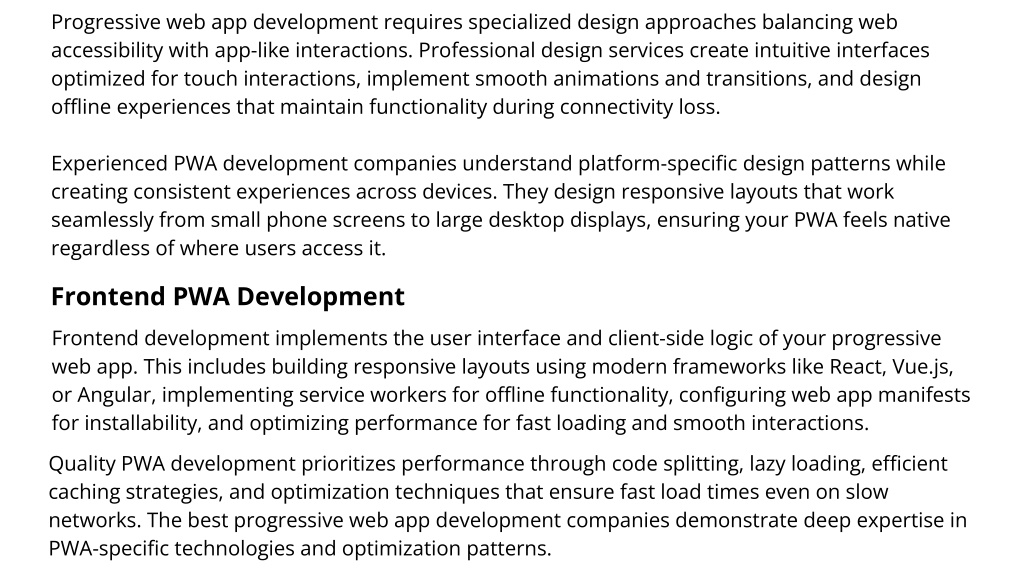 Progressive web app development requires specialized design approaches balancing web accessibility with app-like interactions. Professional design services create intuitive interfaces optimized for touch interactions, implement smooth animations and transitions, and design offline experiences that maintain functionality during connectivity loss. Experienced PWA development companies understand platform-specific design patterns while creating consistent experiences across devices. They design responsive layouts that work seamlessly from small phone screens to large desktop displays, ensuring your PWA feels native regardless of where users access it. Frontend PWA Development Frontend development implements the user interface and client-side logic of your progressive web app. This includes building responsive layouts using modern frameworks like React, Vue.js, or Angular, implementing service workers for offline functionality, configuring web app manifests for installability, and optimizing performance for fast loading and smooth interactions. Quality PWA development prioritizes performance through code splitting, lazy loading, efficient caching strategies, and optimization techniques that ensure fast load times even on slow networks. The best progressive web app development companies demonstrate deep expertise in PWA-specific technologies and optimization patterns.