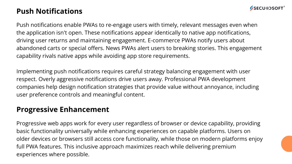 Push Notifications Push notifications enable PWAs to re-engage users with timely, relevant messages even when the application isn't open. These notifications appear identically to native app notifications, driving user returns and maintaining engagement. E-commerce PWAs notify users about abandoned carts or special offers. News PWAs alert users to breaking stories. This engagement capability rivals native apps while avoiding app store requirements. Implementing push notifications requires careful strategy balancing engagement with user respect. Overly aggressive notifications drive users away. Professional PWA development companies help design notification strategies that provide value without annoyance, including user preference controls and meaningful content. Progressive Enhancement Progressive web apps work for every user regardless of browser or device capability, providing basic functionality universally while enhancing experiences on capable platforms. Users on older devices or browsers still access core functionality, while those on modern platforms enjoy full PWA features. This inclusive approach maximizes reach while delivering premium experiences where possible.