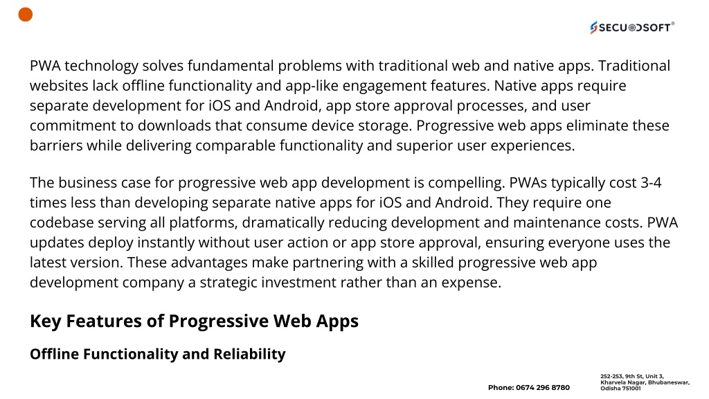 PWA technology solves fundamental problems with traditional web and native apps. Traditional websites lack offline functionality and app-like engagement features. Native apps require separate development for iOS and Android, app store approval processes, and user commitment to downloads that consume device storage. Progressive web apps eliminate these barriers while delivering comparable functionality and superior user experiences. The business case for progressive web app development is compelling. PWAs typically cost 3-4 times less than developing separate native apps for iOS and Android. They require one codebase serving all platforms, dramatically reducing development and maintenance costs. PWA updates deploy instantly without user action or app store approval, ensuring everyone uses the latest version. These advantages make partnering with a skilled progressive web app development company a strategic investment rather than an expense. Key Features of Progressive Web Apps Offline Functionality and Reliability 252-253, 9th St, Unit 3, Kharvela Nagar, Bhubaneswar, Odisha 751001 Phone: 0674 296 8780