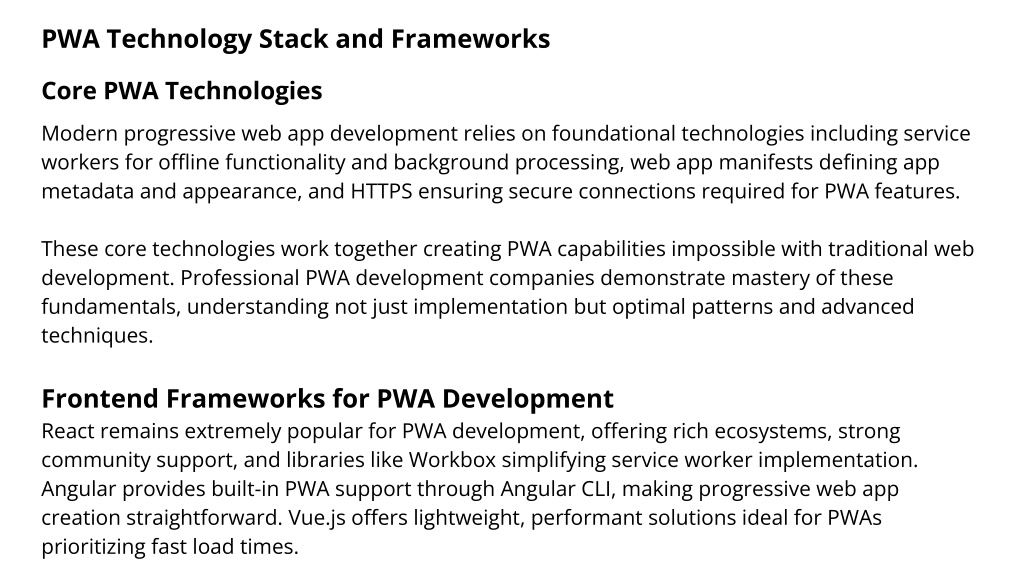 PWA Technology Stack and Frameworks Core PWA Technologies Modern progressive web app development relies on foundational technologies including service workers for offline functionality and background processing, web app manifests defining app metadata and appearance, and HTTPS ensuring secure connections required for PWA features. These core technologies work together creating PWA capabilities impossible with traditional web development. Professional PWA development companies demonstrate mastery of these fundamentals, understanding not just implementation but optimal patterns and advanced techniques. Frontend Frameworks for PWA Development React remains extremely popular for PWA development, offering rich ecosystems, strong community support, and libraries like Workbox simplifying service worker implementation. Angular provides built-in PWA support through Angular CLI, making progressive web app creation straightforward. Vue.js offers lightweight, performant solutions ideal for PWAs prioritizing fast load times.