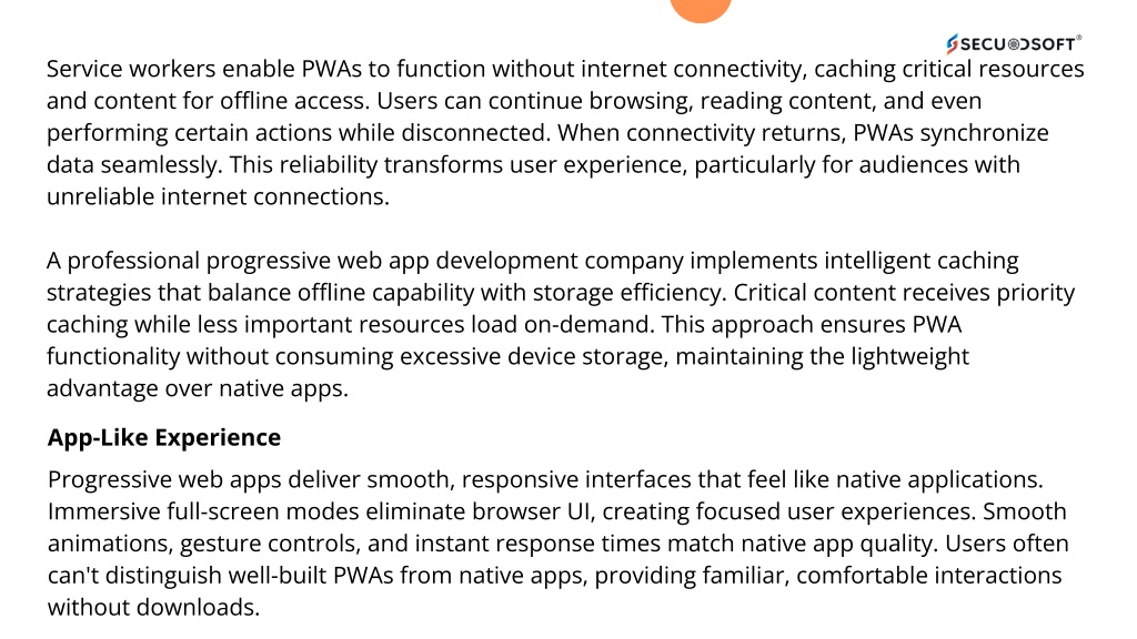Service workers enable PWAs to function without internet connectivity, caching critical resources and content for offline access. Users can continue browsing, reading content, and even performing certain actions while disconnected. When connectivity returns, PWAs synchronize data seamlessly. This reliability transforms user experience, particularly for audiences with unreliable internet connections. A professional progressive web app development company implements intelligent caching strategies that balance offline capability with storage efficiency. Critical content receives priority caching while less important resources load on-demand. This approach ensures PWA functionality without consuming excessive device storage, maintaining the lightweight advantage over native apps. App-Like Experience Progressive web apps deliver smooth, responsive interfaces that feel like native applications. Immersive full-screen modes eliminate browser UI, creating focused user experiences. Smooth animations, gesture controls, and instant response times match native app quality. Users often can't distinguish well-built PWAs from native apps, providing familiar, comfortable interactions without downloads.