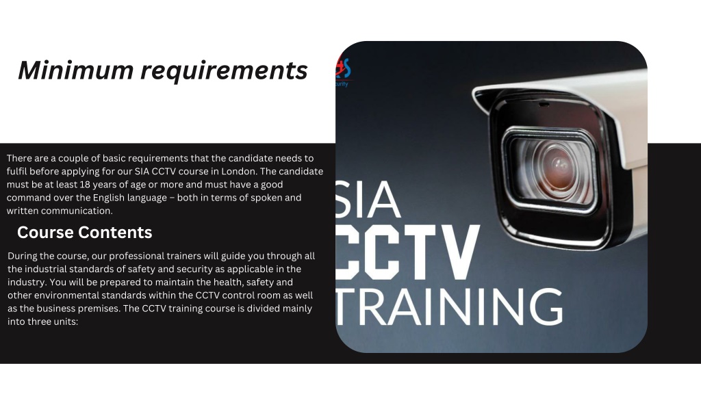 Minimum requirements There are a couple of basic requirements that the candidate needs to fulfil before applying for our SIA CCTV course in London. The candidate must be at least 18 years of age or more and must have a good command over the English language – both in terms of spoken and written communication. Course Contents During the course, our professional trainers will guide you through all the industrial standards of safety and security as applicable in the industry. You will be prepared to maintain the health, safety and other environmental standards within the CCTV control room as well as the business premises. The CCTV training course is divided mainly into three units: