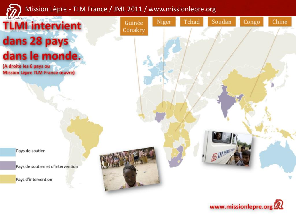 Mission Lèpre - TLM France / JML 2011 / www.missionlepre.org A propos de mission lèpre • TLM œuvre auprès de ceux qui ont la lèpre depuis 1874. • TLM Soutien 200 programmes dans 28 pays à travers le monde. • Nos services couvrent une population de 330 millions de personnes. • projets incluent : les hôpitaux, le suivi santé, l'éducation, la formation professionnelle, les activités génératrices de revenus, la prévention des invalidités, les programmes de logements à bas coût.